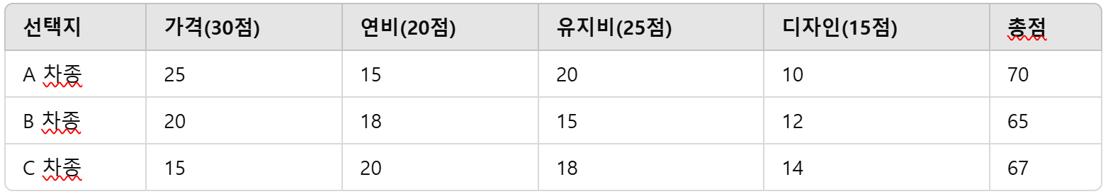 - 각 항목에 가중치를 부여하여 점수를 매깁니다.